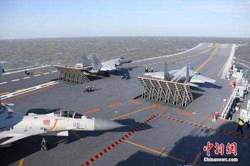 图为歼—15舰载战斗机依次从辽宁舰起飞参加实弹射击演习。中新社发 莫小亮 摄