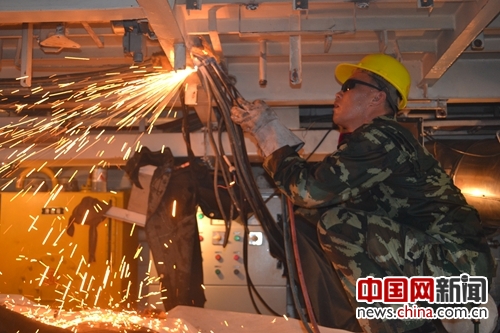 孟祥江在对船体部件进行焊接。杨海松 摄