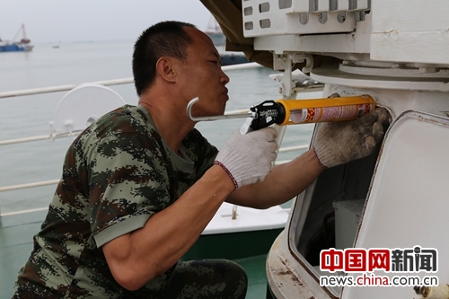 孟祥江在对船体进行保养。杨海松 摄
