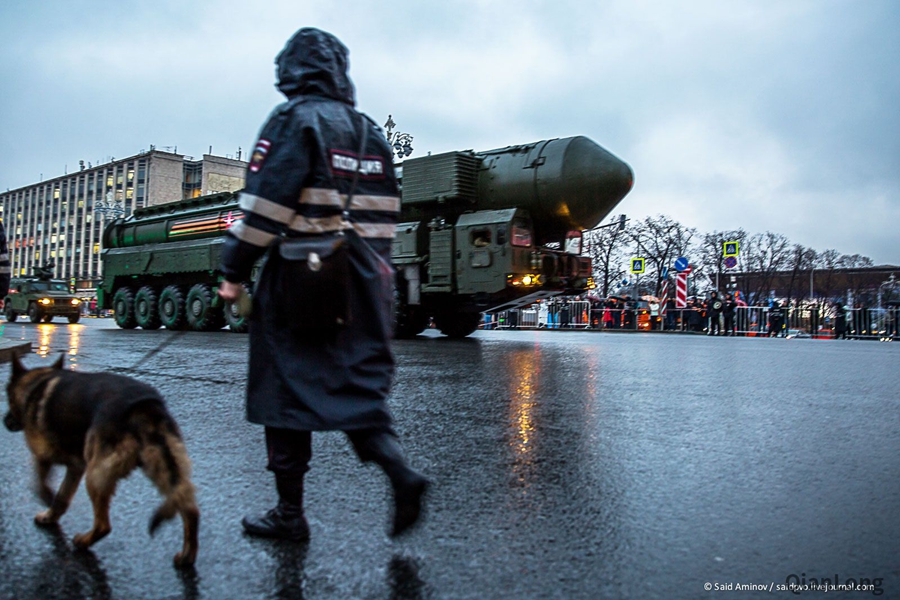 19.参加阅兵彩排的RS-24“亚尔斯”洲际弹道导弹发射/运载车。北约编号为SS-29,采用了分导式多弹头的设计,2007年5月29日进行了首次发射测试,并于2010年开始进行战备部署。根据计划,SS-29将会取代之前的SS-18“撒旦”系列洲际弹道导弹(R-36)和SS-19“匕首”洲际弹道导弹(UR-100N)。RS-24“亚尔斯”洲际弹道导弹的射程为11000千米。最大飞行速度为24500千米/时(20倍音速),采用惯性制导同GLONASS制导相结合的制导方式。可以通过发射井以及公路机动的方式进行发射。