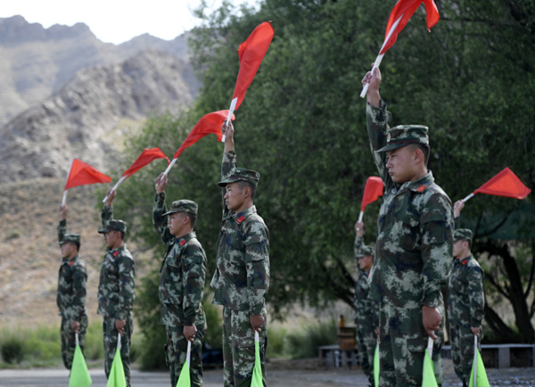 武警宁夏总队新训驾驶员在进行旗语训练(6月8日摄)。