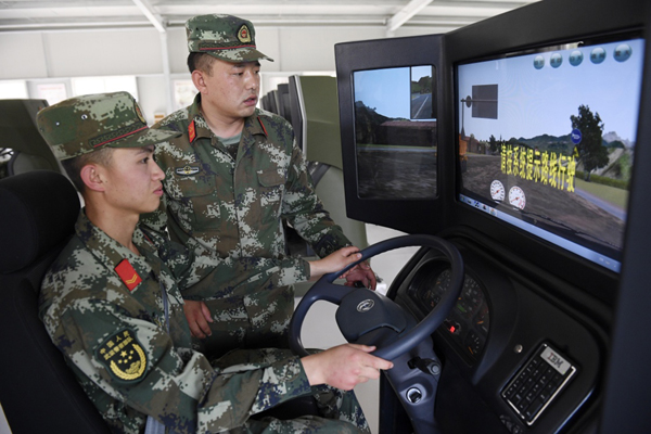 6月12日,武警宁夏总队新训驾驶员在训练基地进行驾驶模拟训练。