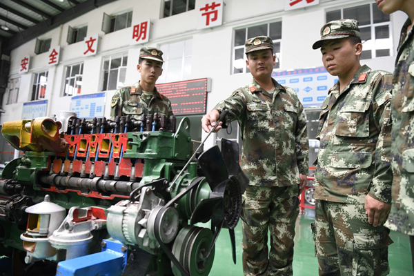 6月12日,武警宁夏总队新训驾驶员在训练基地学习机械知识。