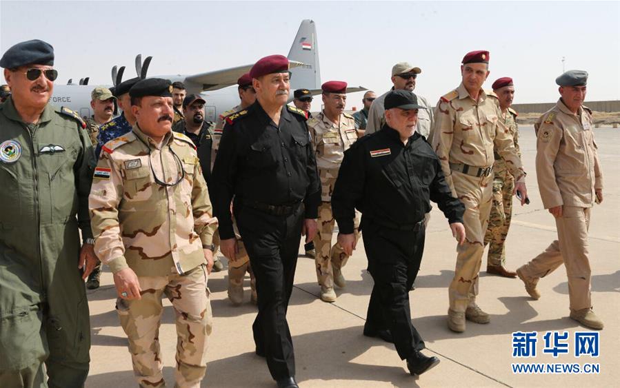 7月9日,伊拉克总理阿巴迪(前排左四)抵达摩苏尔。伊拉克总理兼武装力量总司令海德尔·阿巴迪9日宣布,政府军在摩苏尔战役中取得胜利。新华社发(伊拉克总理办公室供图)