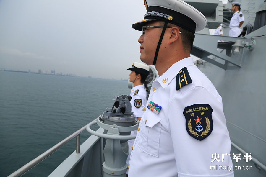 郑州舰舰长陈曦带领官兵列队准备接受海上检阅。陶宏祥 摄