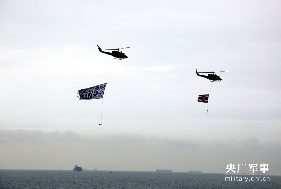 泰国直升机悬挂东盟成立50周年会旗飞越国际舰队。陶宏祥 摄