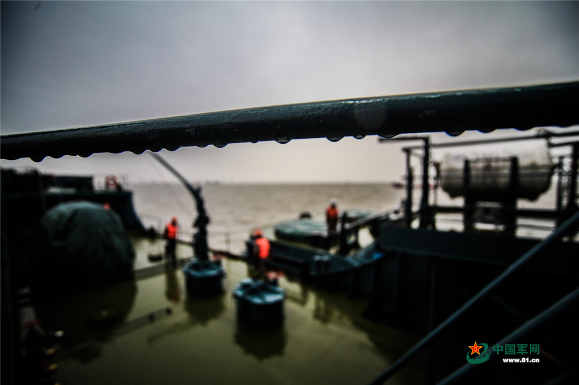 并靠的拖船,马上就要起航,当走出船舱,一阵疾风差点将人吹回房间。天空阴沉,淅沥的小雨一夜间打湿了甲板,并形成了积水。而疾风并未影响帆缆班船员工作,风雨中穿着橘红色救生衣的战士们,成为了阴沉天空下最艳丽的一抹色彩。