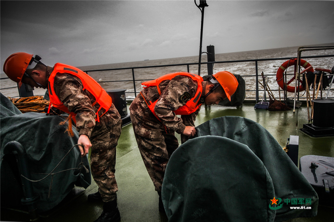帆缆班的战士们在风雨中巡视。