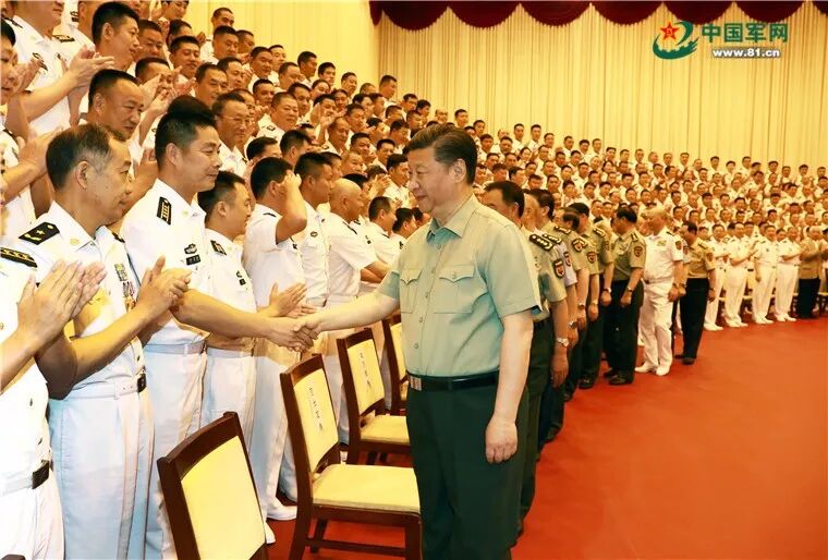 习近平主席检阅部队并发表重要讲话。他强调,“在新时代的征程上,在实现中华民族伟大复兴的奋斗中,建设强大的人民海军的任务从来没有像今天这样紧迫。要深入贯彻新时代党的强军思想,坚持政治建军、改革强军、科技兴军、依法治军,坚定不移加快海军现代化进程,善于创新,勇于超越,努力把人民海军全面建成世界一流海军。”