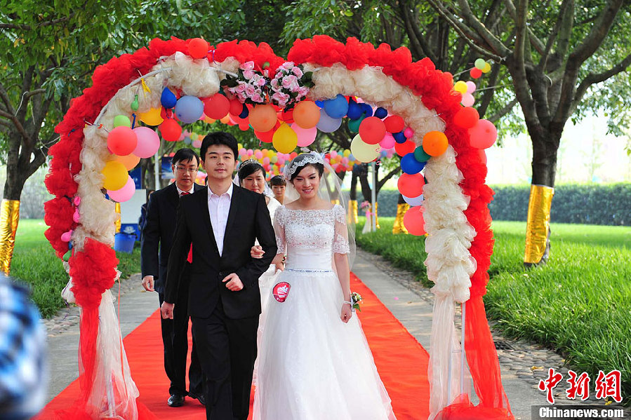 10月26日,在三峡工程蓄水发电十周年之际,共青团湖北省委、湖北日报传媒集团、共青团宜昌市委、湖北日报传媒集团三峡晚报联合主办“中国三峡大坝大型集体婚礼”,来自全国各地的60对新人在三峡截流纪念园喜结良缘。图为新人入场。刘康摄