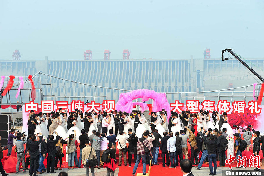 10月26日,在三峡工程蓄水发电十周年之际,共青团湖北省委、湖北日报传媒集团、共青团宜昌市委、湖北日报传媒集团三峡晚报联合主办“中国三峡大坝大型集体婚礼”,来自全国各地的60对新人在三峡截流纪念园喜结良缘。图为新人深情拥吻。刘康摄