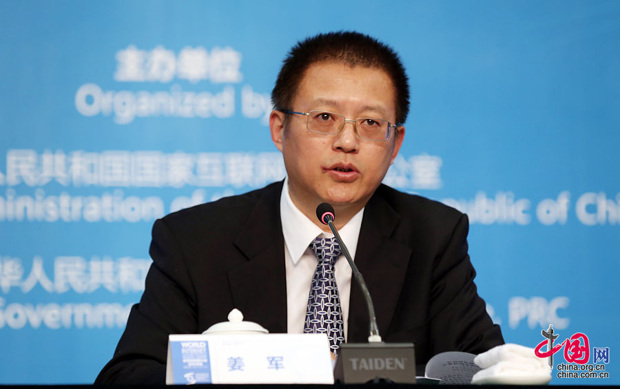 11月18日下午,在乌镇西栅景区通安客栈多功能厅举办首届世界互联网大会乌镇峰会开幕新闻发布会。图为首届世界互联网大会新闻发言人、国家互联网信息办公室网络新闻信息传播局局长姜军。 中国网 董宁 摄影