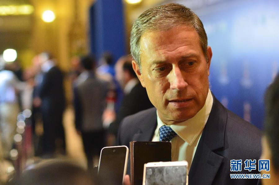 4月14日,中国国家足球队主教练佩兰接受媒体访问。当日,2018年俄罗斯世界杯亚洲区预选赛40强抽签仪式在马来西亚首都吉隆坡举行。中国队与卡塔尔、马尔代夫、不丹、中国香港分在一组。新华社发(张纹综摄)