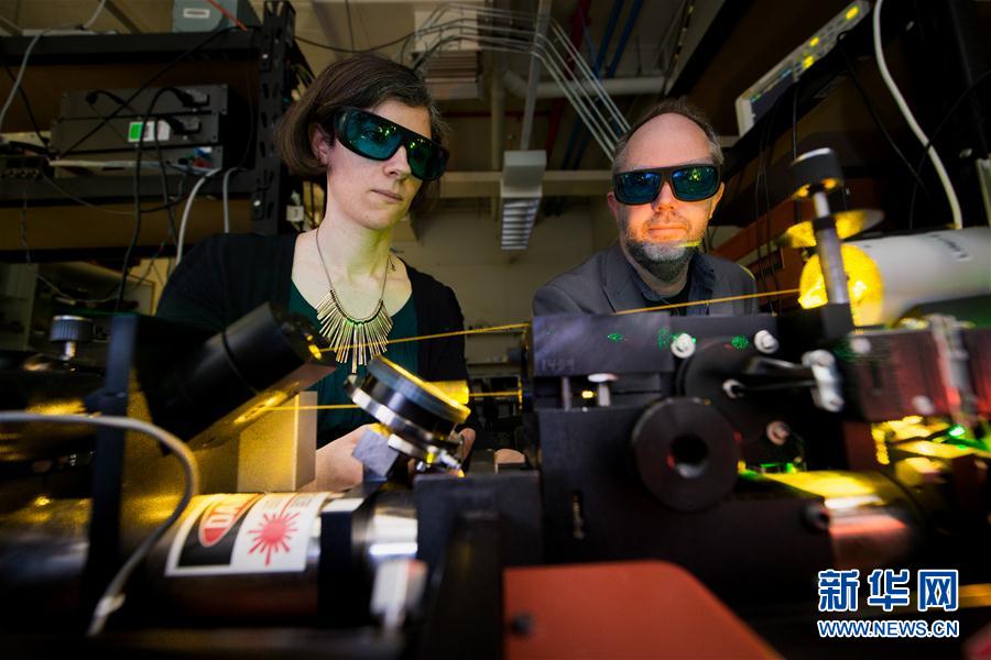 9月6日,在位于堪培拉的澳大利亚国立大学,负责量子数据存储研究的该大学副教授马修·塞拉斯(右)观看罗丝·阿勒费尔特博士做实验。