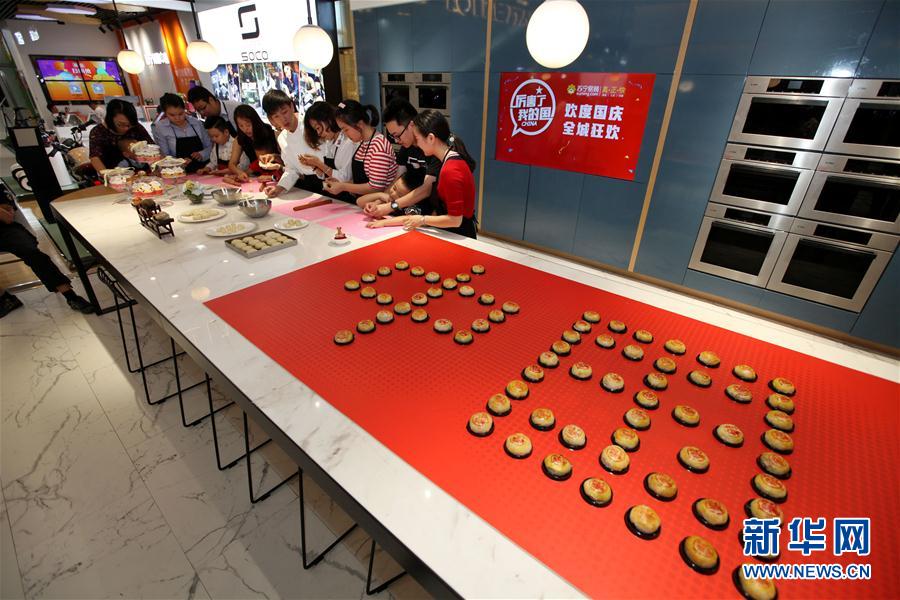 10月1日,市民在无锡苏宁广场的烘焙体验区学习制作苏式月饼。68只新出炉的苏式月饼拼成了“中国”字样。当日是国庆节,全国各地举行丰富多彩的活动欢度国庆。新华社发(宦玮 摄)