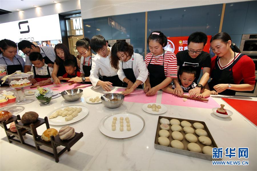 10月1日,市民在无锡苏宁广场的烘焙体验区学习制作苏式月饼。68只新出炉的苏式月饼拼成了“中国”字样。当日是国庆节,全国各地举行丰富多彩的活动欢度国庆。新华社发(宦玮 摄)