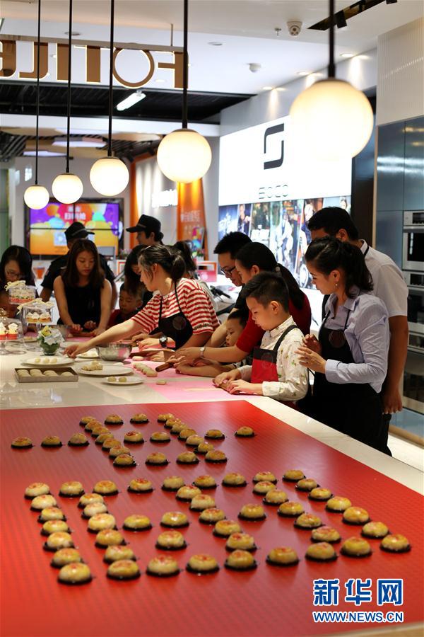 10月1日,市民在无锡苏宁广场的烘焙体验区学习制作苏式月饼。68只新出炉的苏式月饼拼成了“中国”字样。当日是国庆节,全国各地举行丰富多彩的活动欢度国庆。新华社发(宦玮 摄)