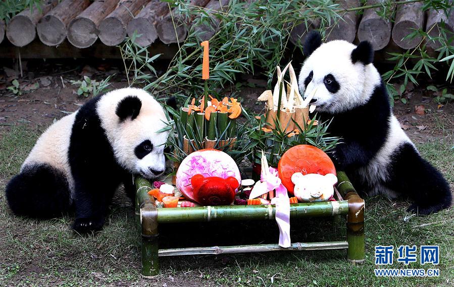 10月4日,大熊猫龙凤胎“月月”和“半半”享用生日蛋糕。当日,上海野生动物园为大熊猫龙凤胎“月月”“半半”举行一周岁生日庆祝活动。目前,“月月”“半半”体重分别为29公斤和27公斤,生长情况良好。新华社记者凡军 摄