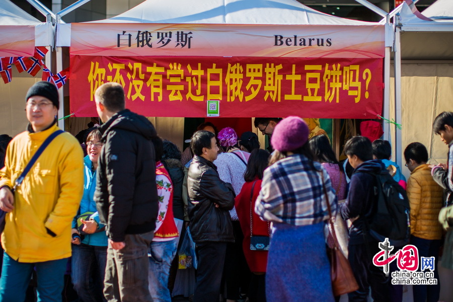 白俄罗斯驻华使馆展台前的招牌吸引很多游客前来品尝。中国网记者 郑亮摄