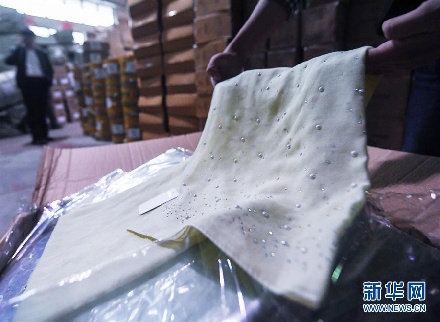 2017年11月9日,在义乌港货代仓库内,工作人员展示将要通过中欧班列发往西班牙的围巾。新华社记者 徐昱 摄