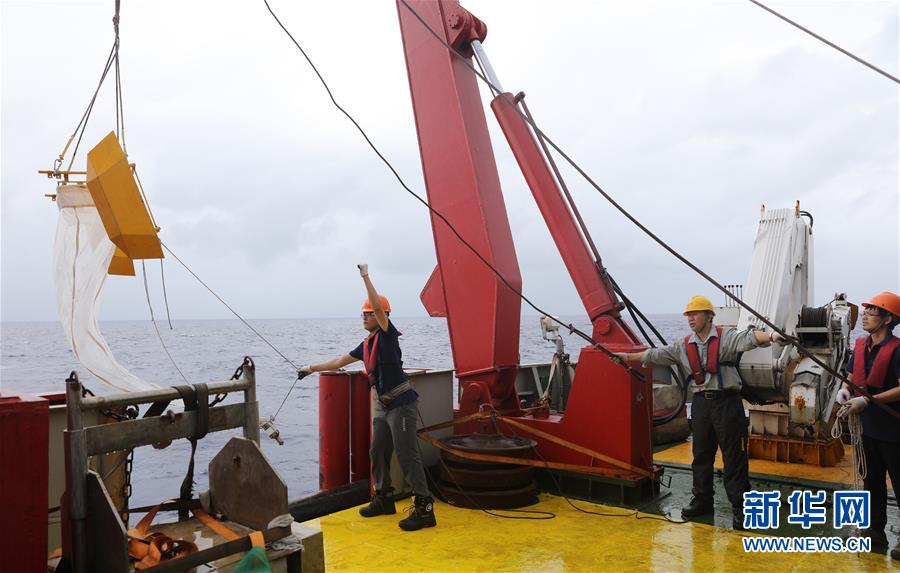 科考队员用“雪龙”号后甲板的绞车和A型架等大型设备将微塑料采样器放入海中(11月19日摄)。11月19日,中国第34次南极科学考察队队员在西太平洋海域进行海洋微塑料取样作业,这是科考队出征以来首次在航线上开展调查作业。新华社记者白国龙 摄