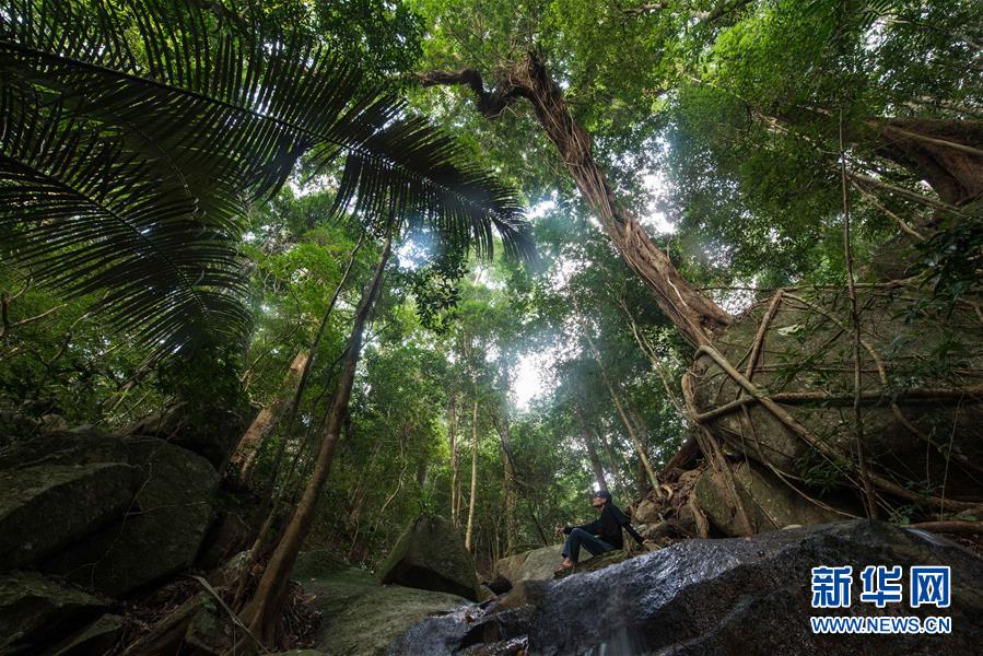监测队员在雨林中进行观测(2017年10月26日摄)。新华社记者 卜多门摄