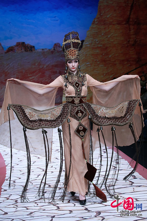 2016年3月27日,模特在梅赛德斯-奔驰中国国际时装周(2016春夏系列)上展示陶陶设计的时装作品。陈健男 摄