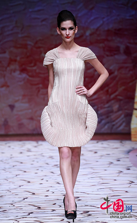2016年3月27日,模特在梅赛德斯-奔驰中国国际时装周(2016春夏系列)上展示陶陶设计的时装作品。陈健男 摄