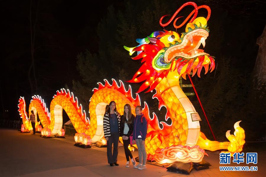 4月7日,游人在匈牙利布达佩斯动物园的龙灯前合影。
