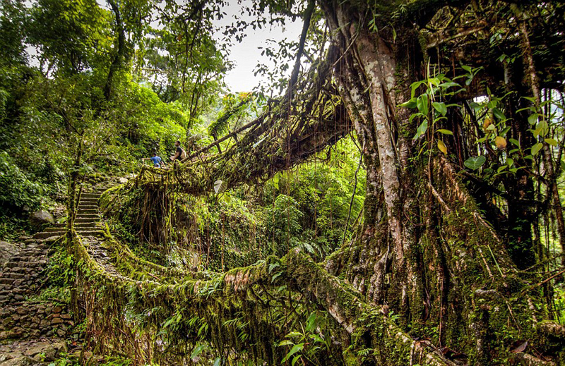 卡西族居民居住在印度梅加拉亚邦山谷深处,该地的强降雨经常导致河水暴涨,往往会切断偏远村庄之间的联系。老一辈的卡西族都是竹筏方面的专家,考虑到竹桥在雨水中浸泡容易腐烂,他们就想到要利用树根建造桥梁。他们在河两岸种植橡皮树(又名印度榕),用辅助工具引导其向特定方向生长,最终形成一座“活桥”。