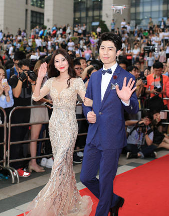 打扮得美美哒穿着礼服的美女与帅哥,像明星一样走了回红毯。学生手挽着手走上红毯。他们在闪光灯的包围下,频频向同学挥手致意,引来阵阵尖叫。