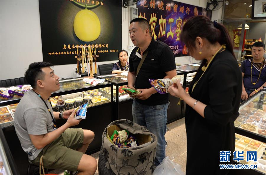6月18日,田波(中)在哈尔滨某商场内向顾客推销自己的坚果。 新华社记者 王凯 摄