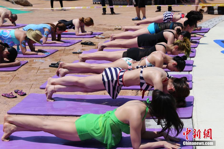帅哥美女齐聚江苏溧阳天目湖 顶烈日挑战“平板撑”