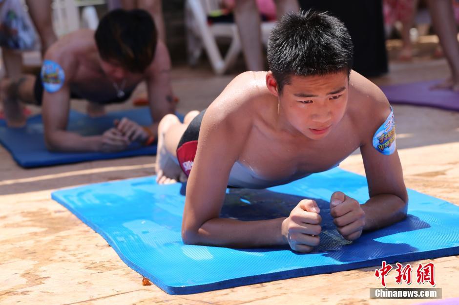 帅哥美女齐聚江苏溧阳天目湖 顶烈日挑战“平板撑”