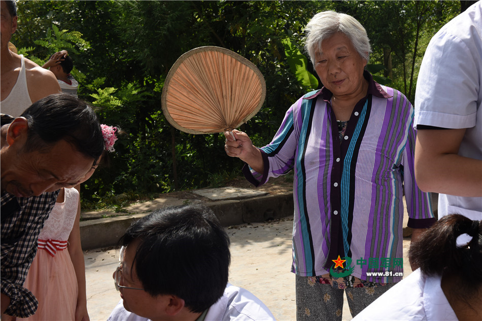 一位村民站在医疗队队员身后,悄悄地为他们扇扇子。记者范显海摄影