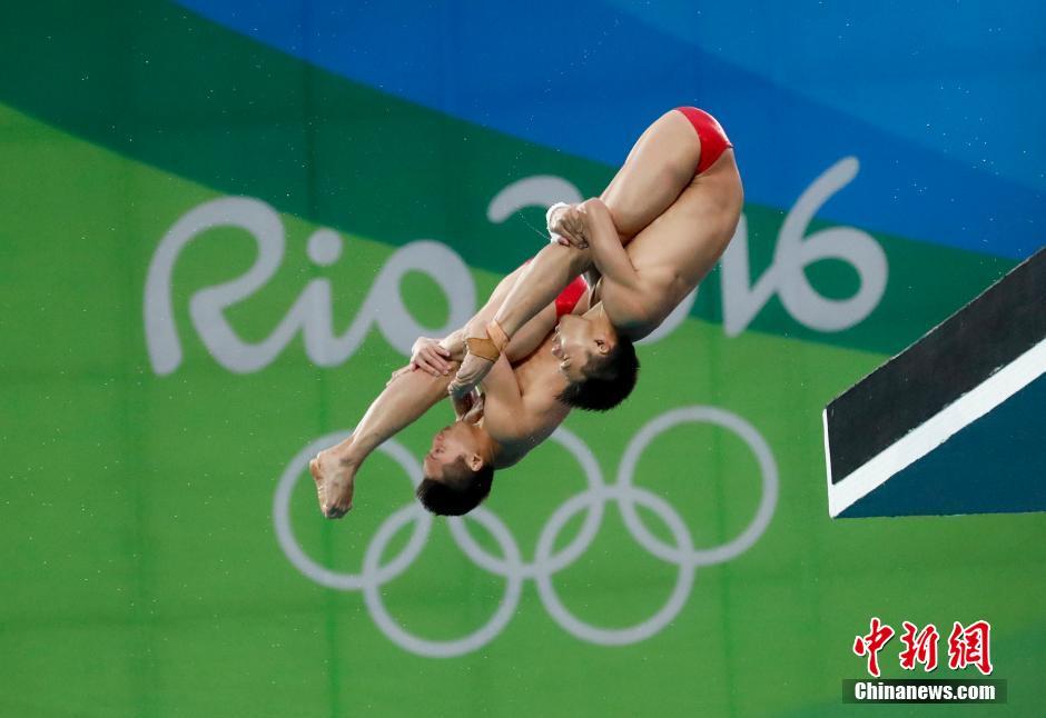 当地时间8月8日,在里约奥运会男子双人十米台决赛中,中国组合林跃/陈艾森一路领先,以巨大优势夺冠,中国队也实现该项目四连冠。图为林跃/陈艾森在比赛中。中新网记者杜洋 摄