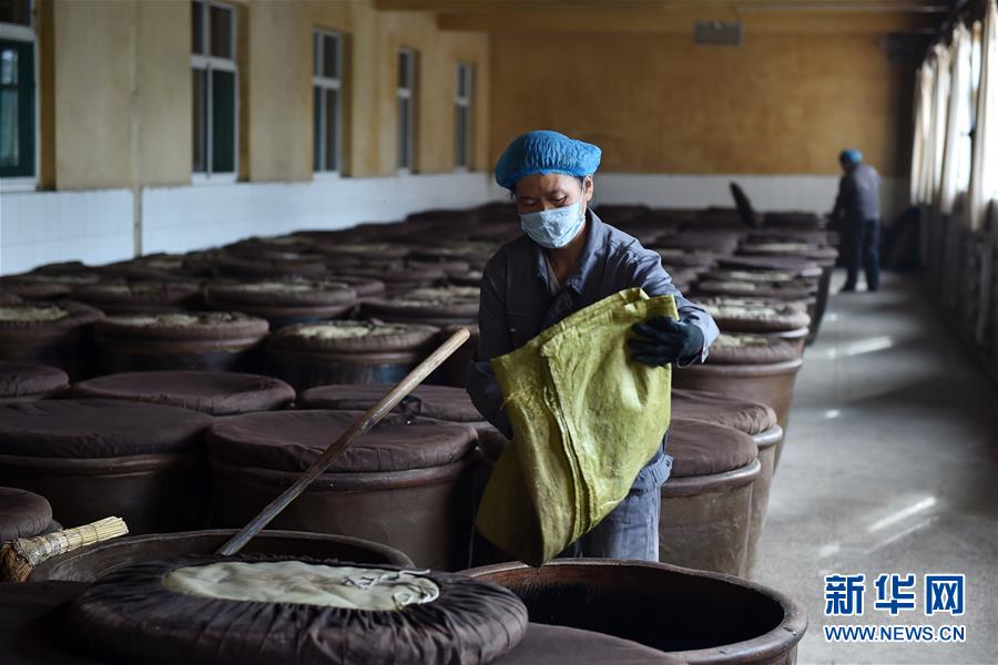 在山西省长治市石圪节瑞福莱醋业公司车间,工作人员将制醋原料进行翻缸(10月11日摄)。