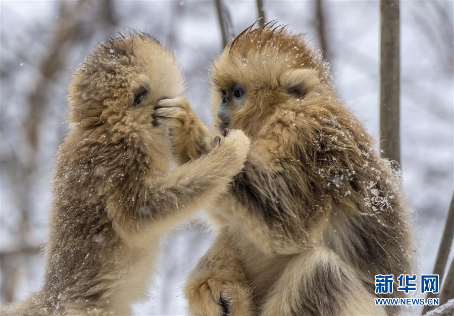 1月10日,在湖北省神农架大龙潭金丝猴保护基地,两只金丝猴在树林中玩耍。经过动物保护人员的多年努力,加之生态环境的不断改善,湖北省神农架金丝猴得到有效保护。目前,神农架金丝猴数量比20世纪80年代最少时增加了一倍多。新华社记者杜华举 摄