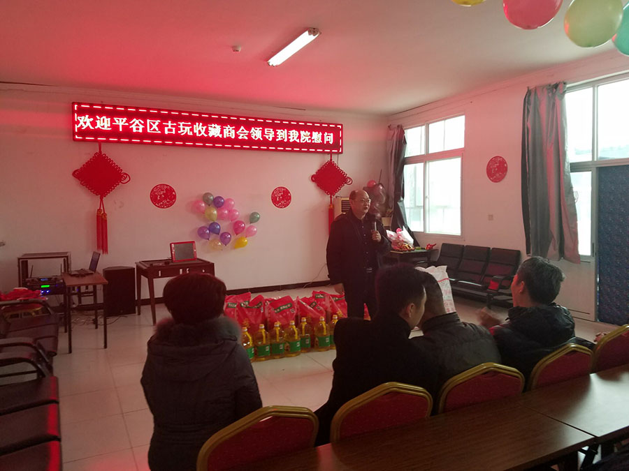 2017年1月16日北京市平谷区工商联收藏协会成员在平谷区工商联领导的带领下,来到了北京市平谷区马昌营镇西双营村对村里的8户贫困家庭进行慰问。西双营村村民605人,属于当地的贫困村,距离县城比较远,村民主要靠种地为生。平谷收藏协会对其中8户特殊户进行一对一的慰问,给他们每户带来大米,免费和食用油。一上午走完西双营村,在工商联领导的带领下,收藏协会成员又前往马昌营镇养老院进行慰问。马昌营敬老院目前入驻孤寡老人100多位,最大岁数的100岁,敬老院有很多来自平谷周边的城区。收藏协会为敬老院送上了大米,面粉,和食用油。老人们看到收藏协会送来的物资,物资慰问人员的手,迟迟不肯松开。收藏协会张宝军会长表示:慰问工作我们会长期做下去,为更多有需要的家庭和个人服务。此次慰问得到北京市平谷区马昌营镇政府领导赞扬。