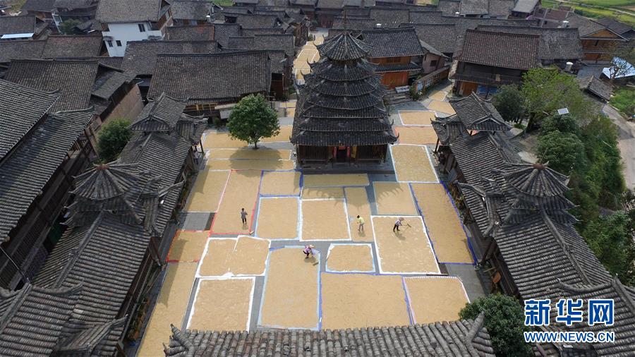 广西三江侗族自治县林溪镇冠小侗寨村民在晾晒稻谷(2016年9月22日摄)。新华社记者 黄孝邦 摄