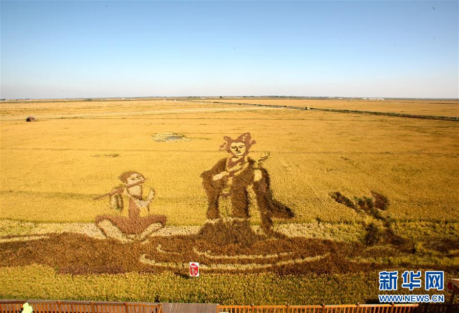 这是在辽宁盘锦一处红海滩生态修复区附近拍摄的稻田画(2016年9月29日摄)。 新华社记者 郭求达 摄