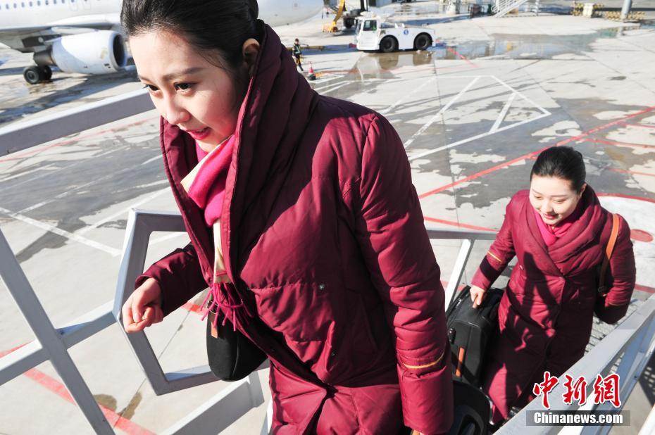 2月17日,辽宁沈阳,姐姐贾冰(左一)妹妹贾雪走员工通道上飞机。这对来自沈阳94年的姐妹花,在南航北方分公司工作一年有余,其间难得有机会一起执行航班,在春运接近尾声之际,姐妹花联袂执行航班服务春运。中新社记者 于海洋 摄