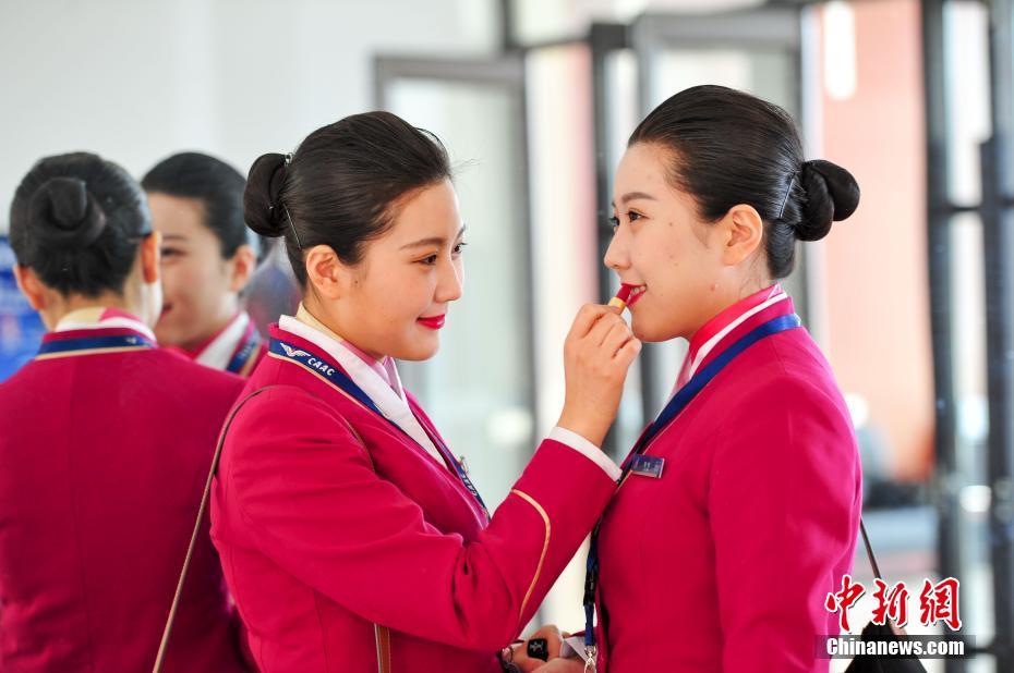 2月17日,辽宁沈阳,姐姐贾冰(左一)给妹妹贾雪涂口红。这对来自沈阳94年的姐妹花,在南航北方分公司工作一年有余,其间难得有机会一起执行航班,在春运接近尾声之际,姐妹花联袂执行航班服务春运。中新社记者 于海洋 摄
