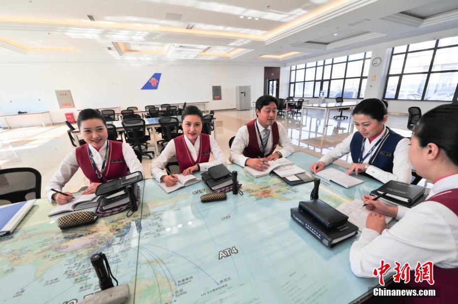 2月17日,辽宁沈阳,姐姐贾冰(左二)妹妹贾雪(左一)在准备室和机组成员一起进行航前协作。这对来自沈阳94年的姐妹花,在南航北方分公司工作一年有余,其间难得有机会一起执行航班,在春运接近尾声之际,姐妹花联袂执行航班服务春运。中新社记者 于海洋 摄