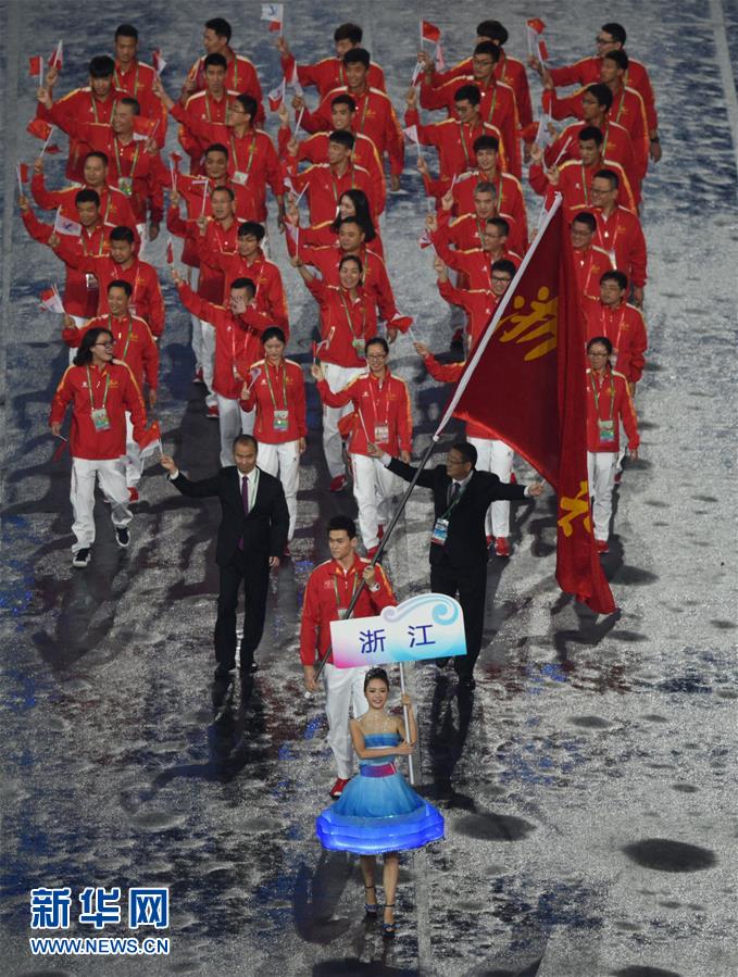8月27日,第十三届全国运动会开幕式在天津奥林匹克中心体育场举行。 这是浙江体育代表团进入开幕式现场。 新华社记者鞠焕宗摄