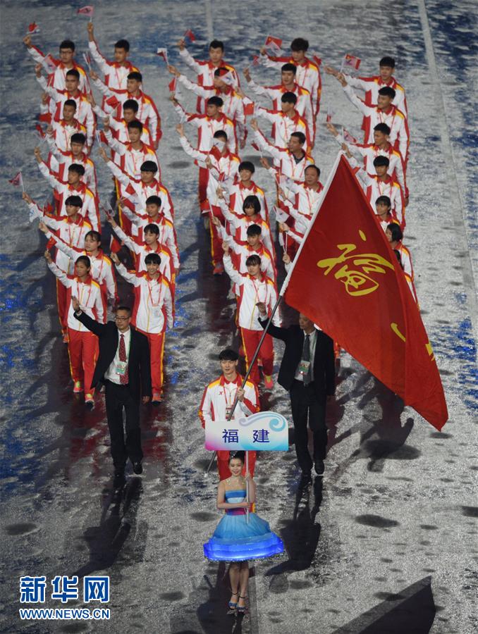8月27日,第十三届全国运动会开幕式在天津奥林匹克中心体育场举行。 这是福建体育代表团进入开幕式现场。 新华社记者鞠焕宗摄