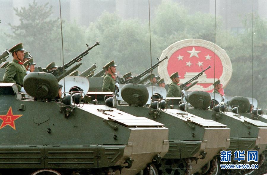 这是1984年国庆阅兵式上,装甲运兵车方阵通过天安门广场。 新华社记者张赫嵩摄(资料照片)"