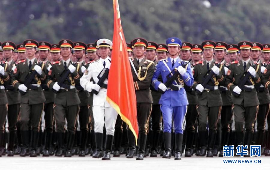 这是1999年国庆典礼上,中国人民解放军三军仪仗队参加阅兵分列式检阅。 新华社记者戚恒摄(资料照片)"