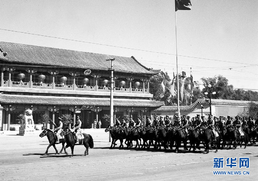 这是1952年国庆阅兵式上,中国人民解放军骑兵部队经过新华门。 新华社发(资料照片)"