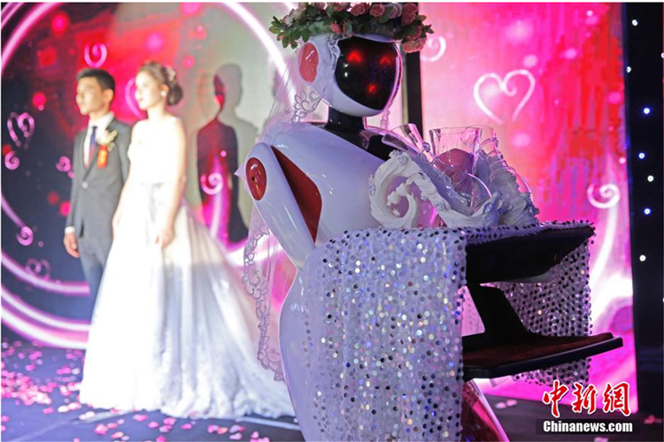天津现机器人当“伴娘” 为新人递婚戒送祝福[组图]